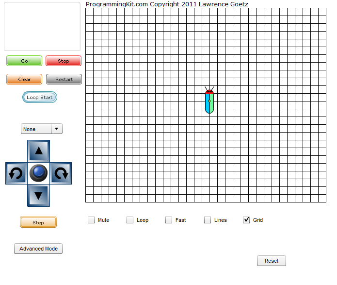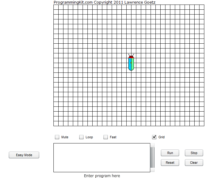Copyright 2011 Lawrence Goetz Here you can learn to write a program for a robot bug. A program is a set of commands for a computer to do. Writing a program means giving instructions to a computer for it to execute. A program is stored in the memory of a computer. Executing a program runs the program from the computer's memory. The computer will follow the instructions given. With ProgrammingKit.com you get practice programming a computer! Kids and adults can have fun moving the bug around and drawing different designs. Parents: Ask your child to have the robot bug walk in a pattern (square, triangle, etc). Use the grid to count the boxes. Ask your child to have the robot bug walk to a particular spot on the screen. Select a programming mode (default is Easy Mode).